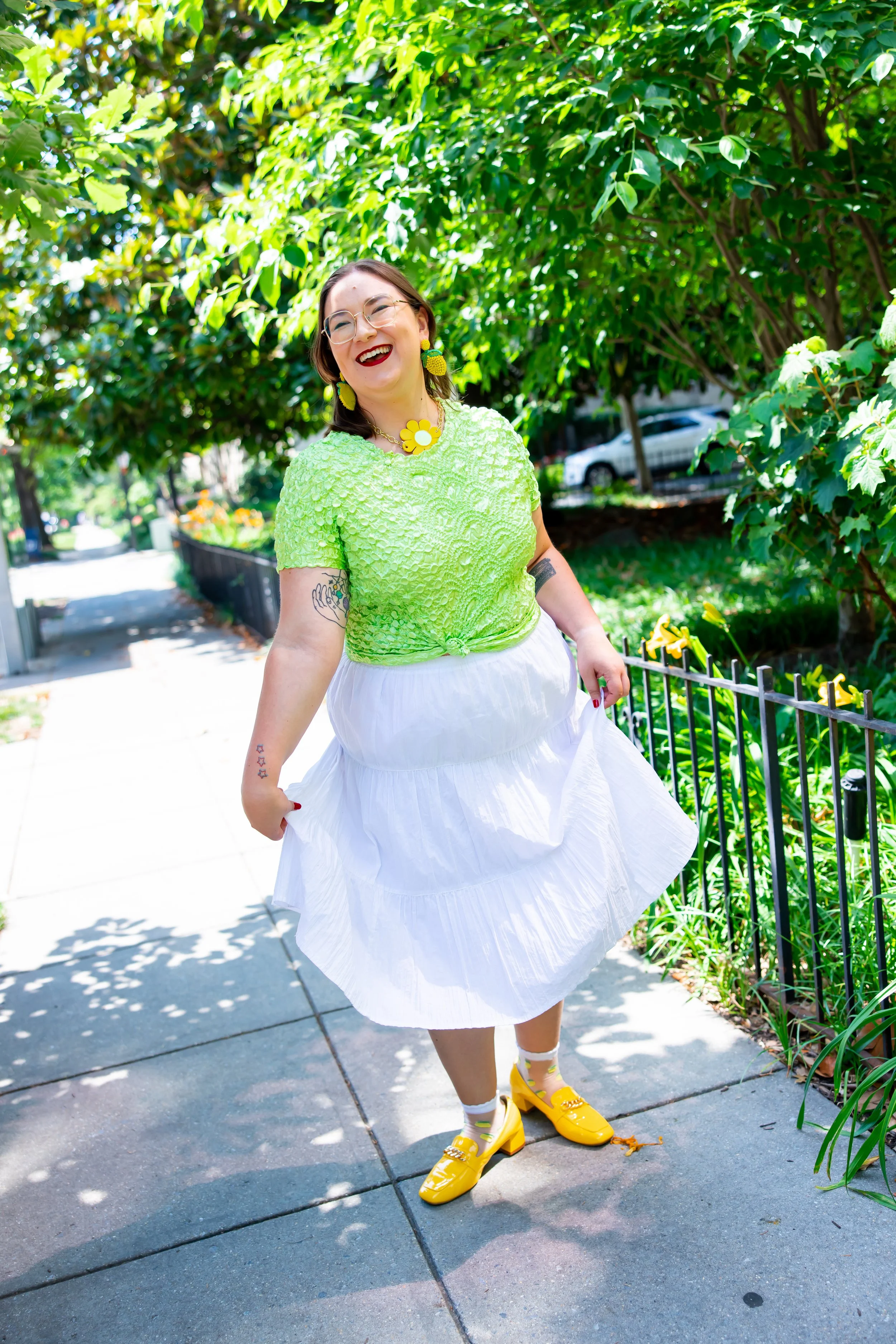Styling Tip: Pair it with your favorite colorful top or a tied tee like in this look. Add bold earrings or floral accessories to keep things playful. It’s perfect for park hangs, weekend markets, or dancing under the sun.